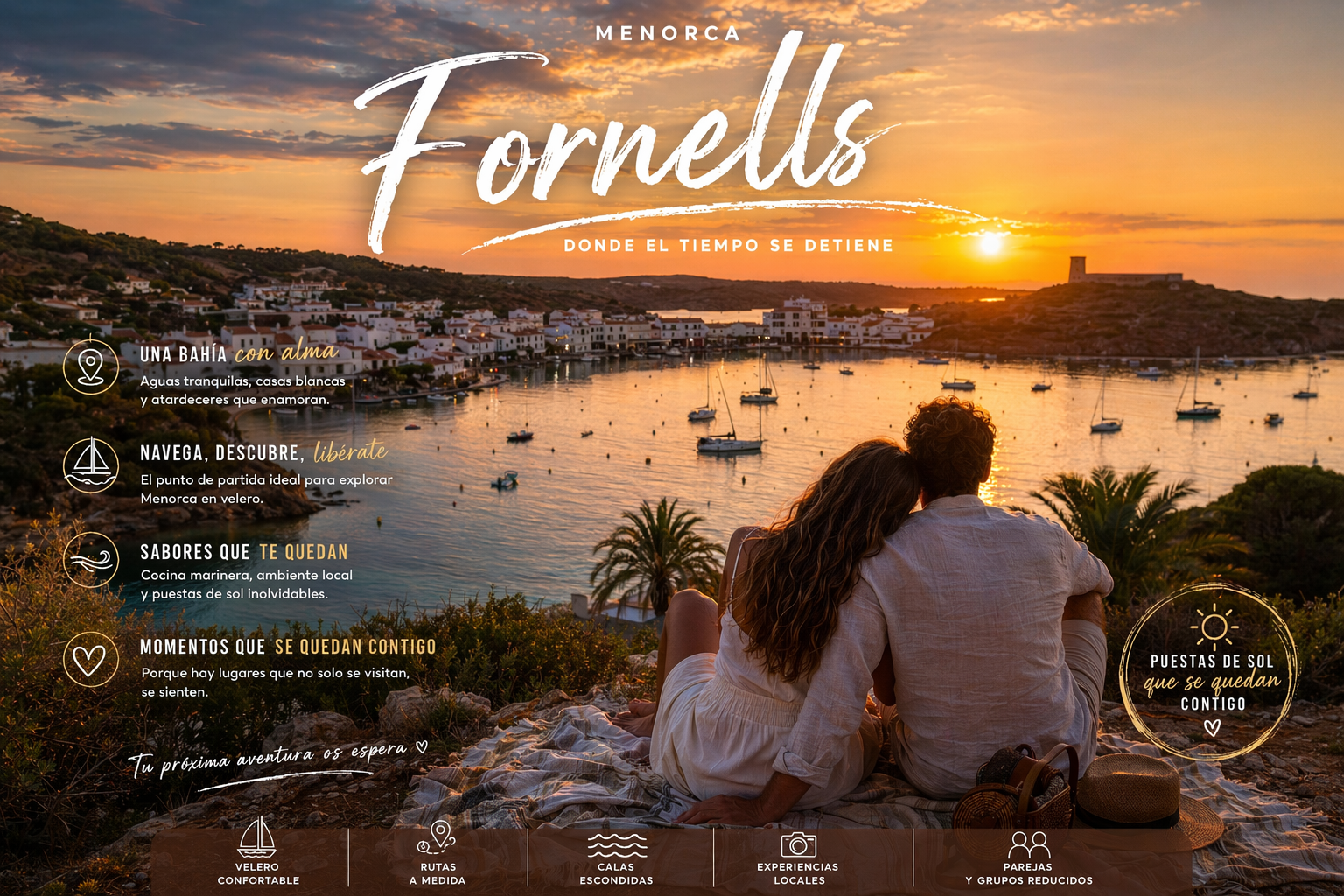 La Bahía de Fornells es uno de esos lugares que te quedas con ganas de no marcharte. Aguas turquesas, el pueblo de pescadores de Fornells con sus casas blancas, la calma de fondear dentro de la bahía y la sensación de estar en otro mundo. Y todo ello llegando en barco, como se merece.