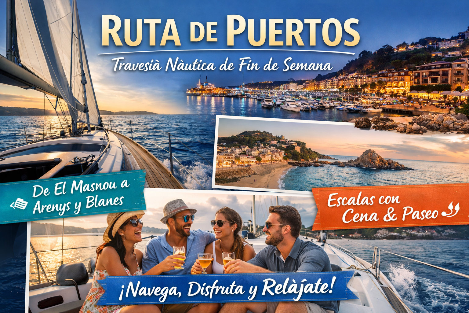 Zarpamos el viernes por la tarde desde El Masnou, navegamos tranquilamente hasta Arenys de Mar, donde pasamos la noche y disfrutamos del ambiente del puerto y su oferta gastronómica.